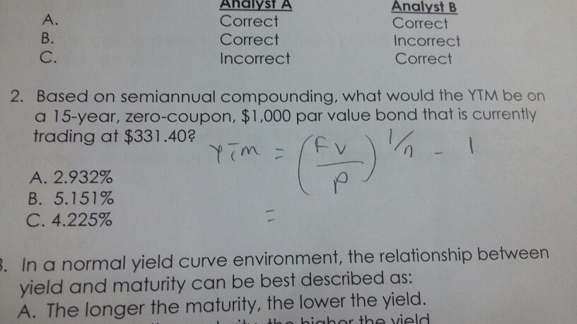 Yield to Maturity The yield to maturity is the yield an investor would receive if they held the bond to the maturity date This is a similar calculation to the yield to call, except that you don't use the call price—the face value is usedA savings bond is an example of a zerocoupon bond because the interest payments are added to the bond's principal value, rather than paid out periodically Holders can check savings bond maturityBondequivalent yield is closest to A)75% B)12% C)30% 6 A spot rate curve is most accurately described as yields to maturity for A)Zerocoupon bonds B)Government bonds C)Money market securities 7 A yield curve for coupon bonds is composed of yields on bonds with similar A)Maturities B)Issuers C)Coupon rates 8